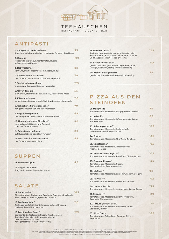 We have left you waiting, but now the time has come: Teehäuschen 2.0 opens its doors in a new light. In our restaurant you can enjoy freshly cooked dishes of the Mediterranean cuisine. Our ice cream parlor invites you to enjoy and indulge. And in our bar and lounge, you can relax with a cool sundowner to finish up your day. We look forward to seeing you!